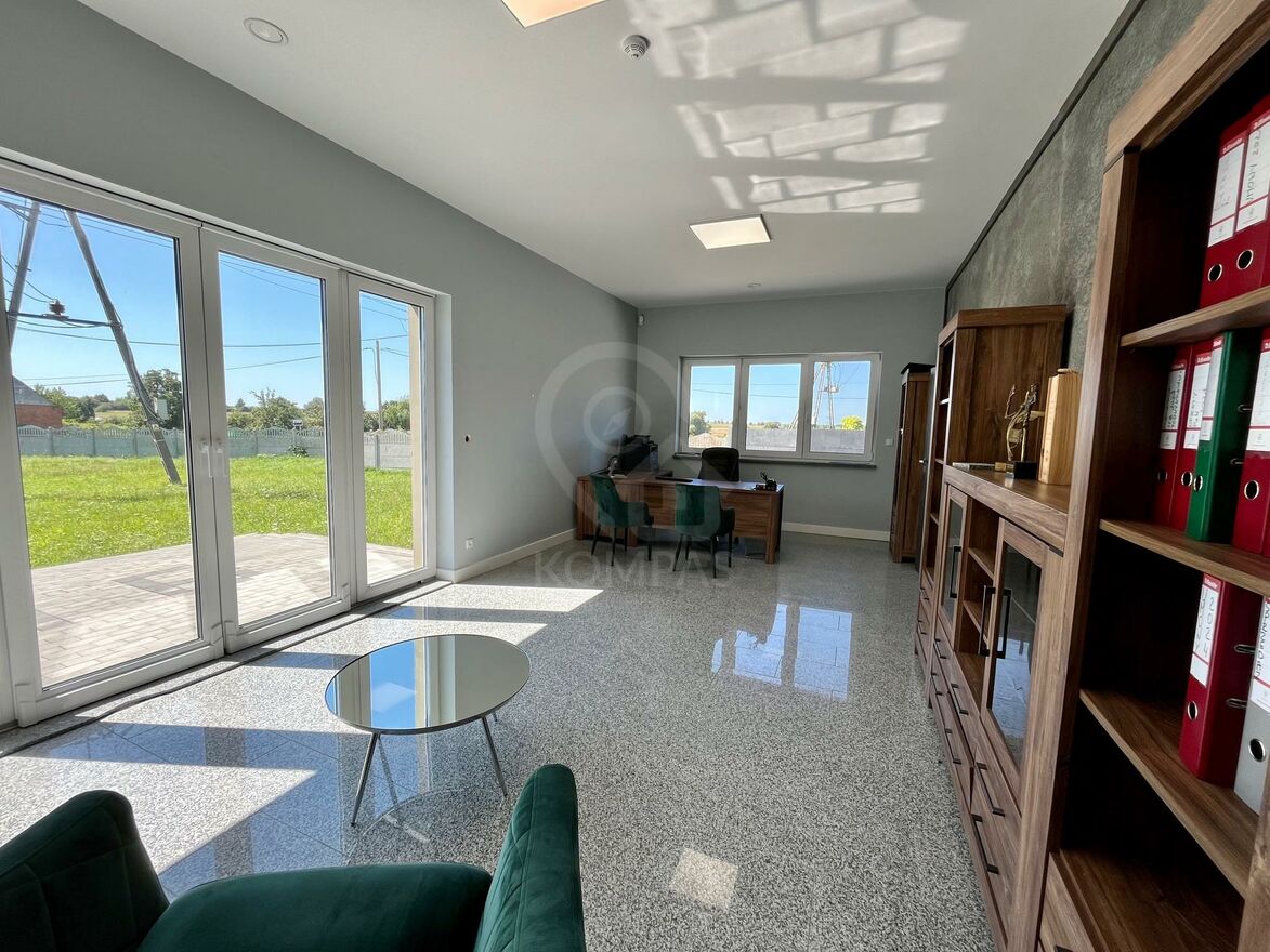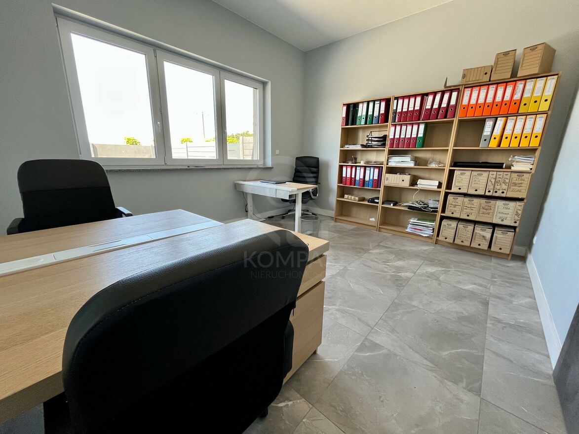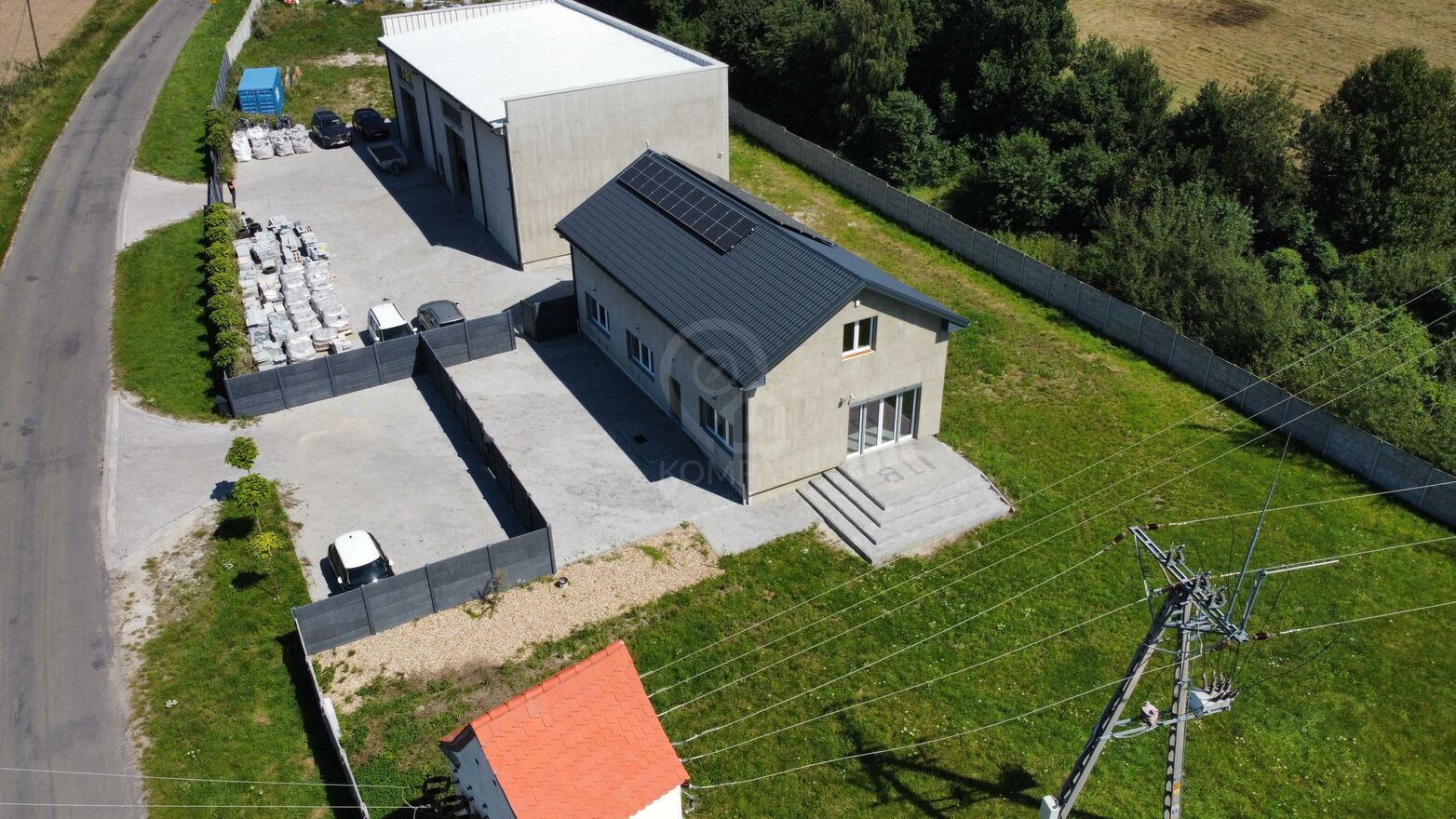 Dom jednorodzinny, który obecnie pełni funkcje biura o łącznej powierzchni ponad 200 m2 rozłożonej na dwóch kondygnacjach. Budynek oddany do użytkowania w 2025 roku. Dół domu jest całkowicie wykończony. Góra jest obecnie w stanie deweloperskim. Budynek wyposażony jest w fotowoltaikę oraz pompę ciepła. Posiada rolety antywłamaniowe sterowane zdalnie. Wysokość pomieszczeń na parterze to 3m. Na piętrze 2,6 m.